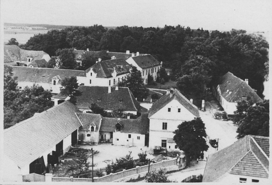 Na tomto obrázku je ještě na břehu rybníka budova bývalého pivovaru a obě křídla zámku nejsou spojena věží, kterou nechali postavit teprve v roce 1939 Přibylové.
