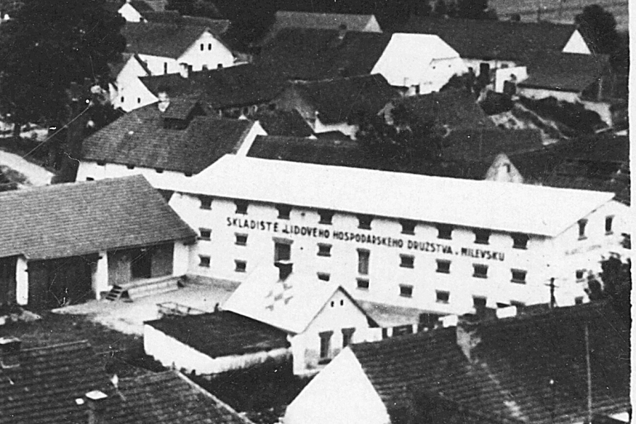 Na budově je nápis: „SKLADIŠTĚ LIDOVÉHO HOSPODÁŘSKÉHO DRUŽSTVA v MILEVSKU.